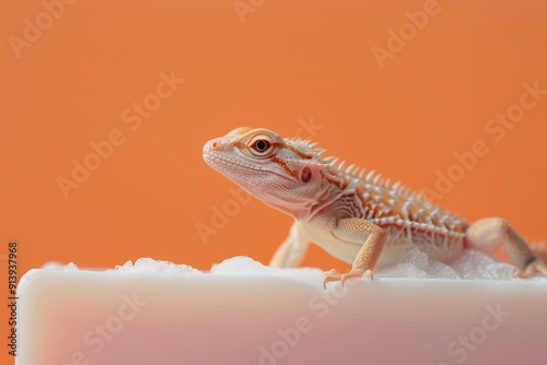 Naklejka premium A green lizard is laying on a soap bar