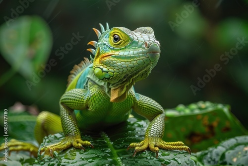Fototapeta premium A green lizard on a leaf