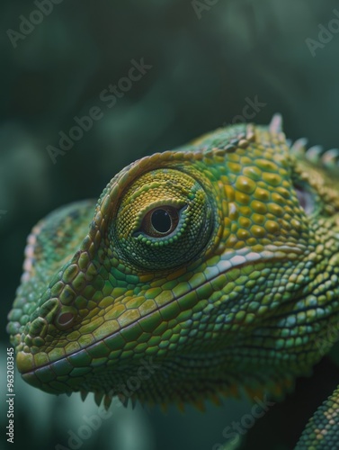 Fototapeta premium A green lizard with a yellow eye. The lizard is looking at the camera