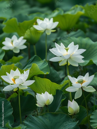 © simba kim, Obraz premium A green lotus leaves, white lotus in full bloom, Generative AI