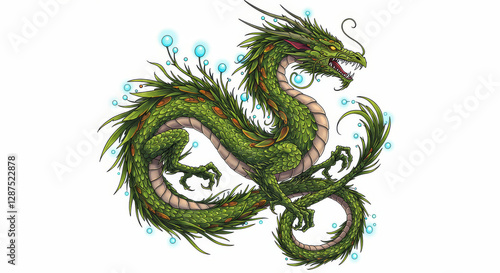 Fototapeta premium A green mythical dragon coils against a plain white background