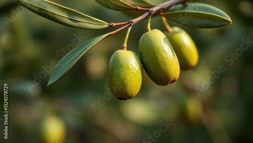 © phet, Obraz premium A green olive hanging from the branch with stem, branch, green, olive