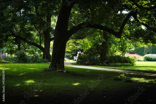 Obraz premium A green park shaded by trees, offering a quiet and peaceful atmosphere