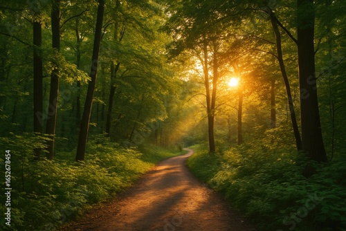 © Holo Frame, Obraz premium A green pathway leading toward sunset scenery