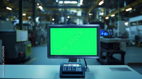 Fototapeta premium A green screen monitor in a factory setting, symbolizing digital integration...
