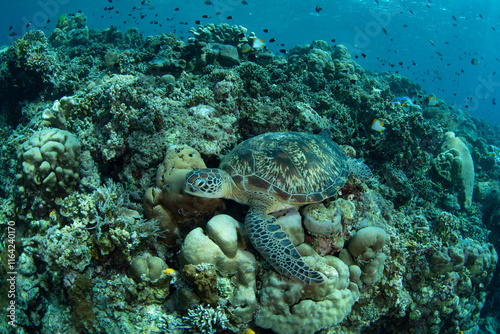 Naklejka premium A Green sea turtle, Chelonia mydas, lays amid corals on a reef drop-off in Bunaken National Marine Park, North Sulawesi, Indonesia. Both Green and Hawksbill sea turtles are prevalent in this park.