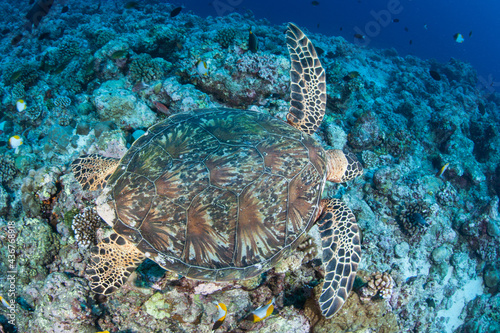 Naklejka premium A Green sea turtle, Chelonia mydas, swims over a coral reef in the Republic of Palau. This reptile is an endangered species due to it being hunted for food in some coastal communities.