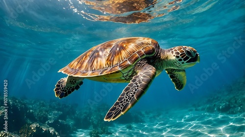 © ArsakhaDevandra, Obraz premium A Green Sea Turtle Swimming Through Clear Blue Ocean Water