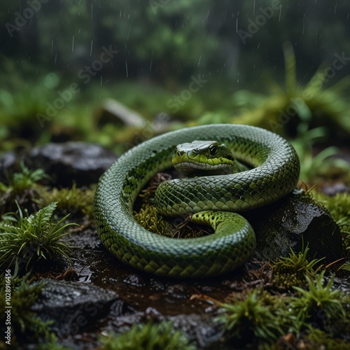 Obraz premium A green snake coiled on mossy rocks in a lush rainforest setting, with rain...