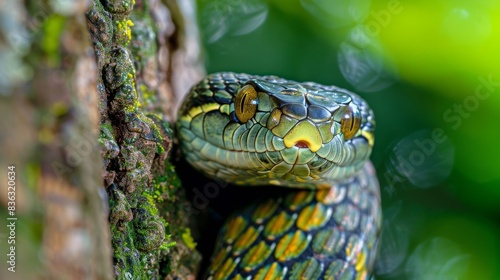© OZTOCOOL, Naklejka premium A green snake is in a leafy green bush