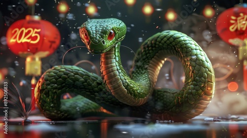 © Tatiana, Fototapeta premium A green snake is on a green background with red roses. New Year's Eve 2025.