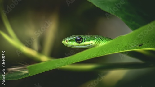 Fototapeta premium A green snake is sitting on a green leaf