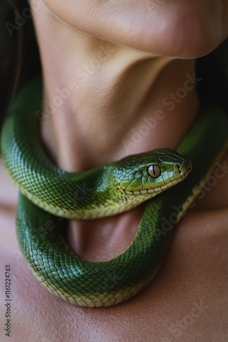 © Fotograf, Obraz premium A green snake is wrapped around a woman's neck in this close-up photo