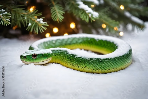 © Shmidt Vladilen, Fototapeta premium A Green Snake under the Christmas tree