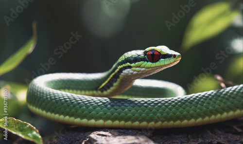 © Miklos, Obraz premium A green snake with red eyes sits coiled on a branch in the forest