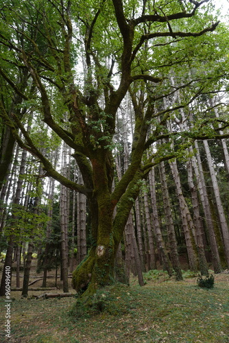 Fototapeta premium A green tall tree in a forest. The curved trunk of the tree is covered with...