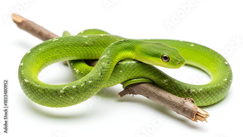Fototapeta premium A green vine snake coiled around a wooden branch on a white background,...