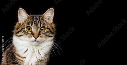 © Alena Mostovich, Obraz premium a grey cat on a black background. a pet, a fluffy pet. illustration. artificial intelligence generator, AI, neural network image. background for the design.