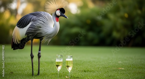 © Asad, Naklejka premium A grey crowned crane stands on a lawn near champagne glasses, an elegant concept representing luxury, nature, and sophisticated outdoor events