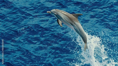 © lililia, Obraz premium A grey dolphin leaps out of a blue pool, its body arched and tail extended