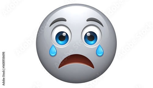 Fototapeta premium A grey emoticon with blue eyes, frowning, and shedding single tears