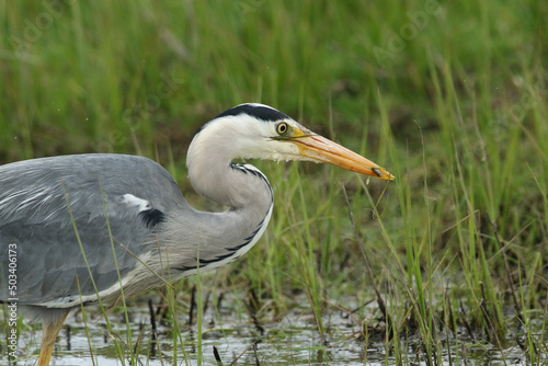 Naklejka premium A Grey Heron, Ardea cinerea, hunting along the edge of a stream. It has just...