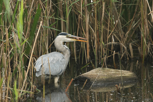 Naklejka premium A Grey Heron, Ardea cinerea, standing in the reeds at the edge of a lake with a fish in its beak that it has just caught and is about to eat.