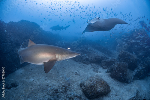 © Timothy, Fototapeta premium A grey nurse shark swimming with mantaray in blue water