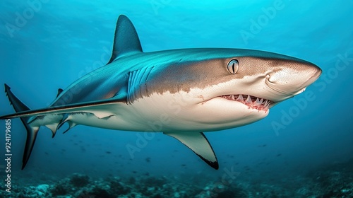 Fototapeta premium A grey reef shark with its mouth open, showing sharp teeth, swims through the...