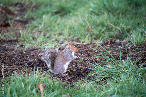 Fototapeta premium a grey squirrel (Sciurus carolinensis) searching out seeds and nuts, ground...