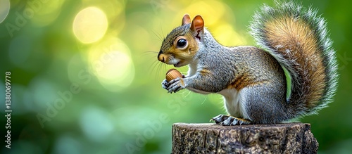 © novri, Fototapeta premium A grey squirrel sitting on a tree stump is holding a nut