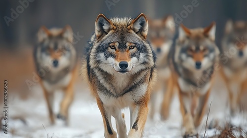 Naklejka premium A grey wolf pack moves through the snow-covered forest, their steps silent in the winter hush.