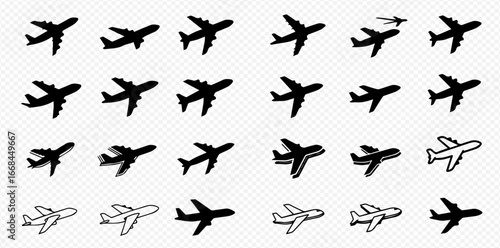 Naklejka premium A grid of diverse airplane icons and silhouettes, illustrating different styles of aircraft for aviation and travel concepts.