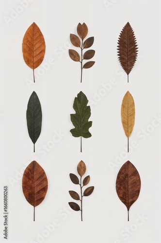 © NaesyaStudio, Obraz premium A grid of nine different autumn leaves in varying shades of brown, green, and yellow, arranged on a light background.