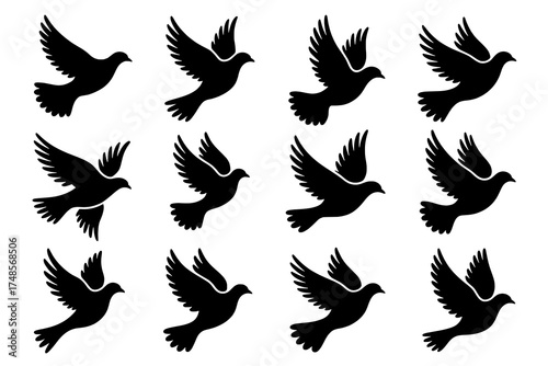 Obraz premium A grid of twelve solid black flying bird silhouettes, each with unique wing and tail positions, set against a pristine white background.