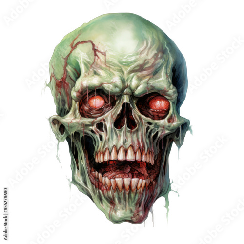 © Fomo Creative, Fototapeta premium A Grotesque Depiction of a Decaying, Rotting Skull with Red Eyes