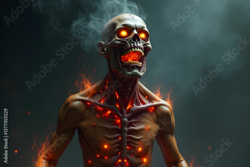 © Gustav, Fototapeta premium A Grotesquely Burnt Zombie Rises From The Ashes With Fiery Eyes And Burning Embers Scattered Across Its Skin Against a Stark, Dark Backdrop Creating a Horrific Scene