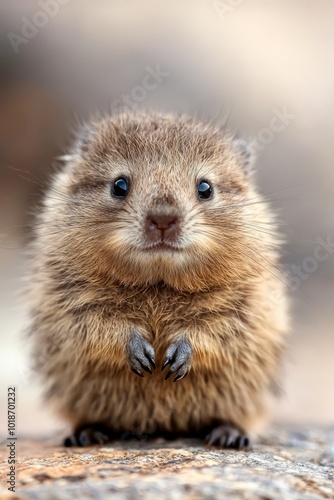 Naklejka premium A groundhog in tight focus, perched on a rock, scrutinizing the camera with a quizzical expression