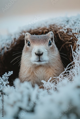 © Irina Kozel, Obraz premium A groundhog peeking out from its burrow surrounded by frost-covered grass