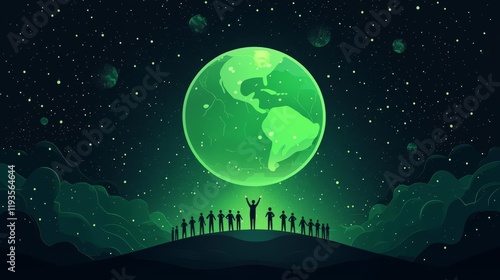 Naklejka premium A group celebrating under a glowing green planet at night.