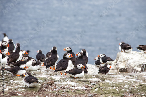 Fototapeta premium A group of A group of Atlantic puffins, a puffin colony on sea cliffs off the Northumbrian coast