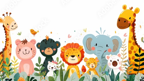 Naklejka premium A group of adorable jungle animals, including a giraffe, lion, elephant, bear...