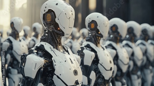 Fototapeta premium A group of advanced, white, robotic soldiers standing in formation, facing...