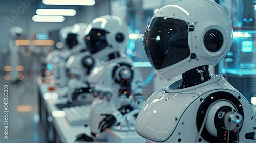 Fototapeta premium A group of AI robots learning and interacting in a state-of-the-art laboratory.