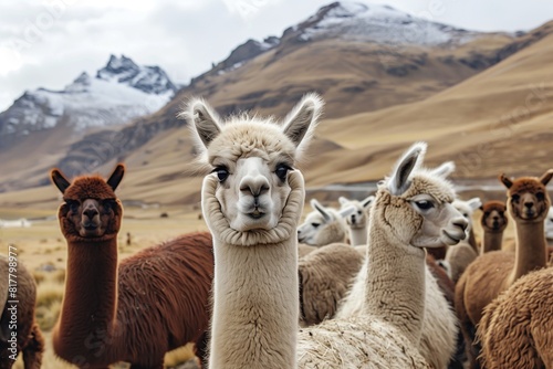Obraz premium A group of alpacas standing in a mountainous landscape with snow-capped peaks...
