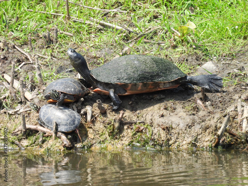 Fototapeta premium A group of aquatic turtles basking in the warmth of the sun. Summer season at...