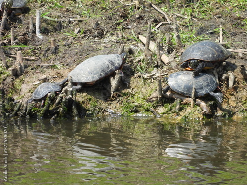 Obraz premium A group of aquatic turtles basking in the warmth of the sun. Summer season at Bombay Hook National Wildlife Refuge, Kent County, Delaware.