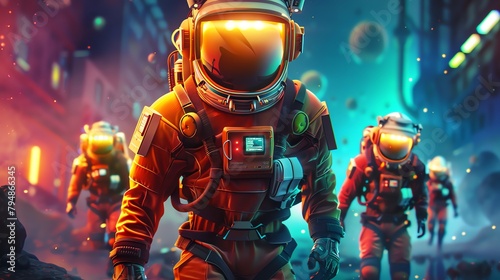 Fototapeta premium A group of astronauts in orange space suits walking on an alien planet