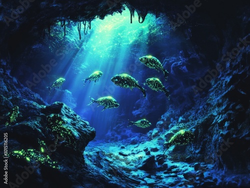 Obraz premium A group of bioluminescent animals lighting up an underwater cave, casting a...