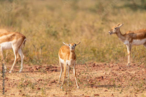 Naklejka premium A Group of black Buck female with its calfs grazing in wild grasslands of bhisnoi village of rajasthan in india